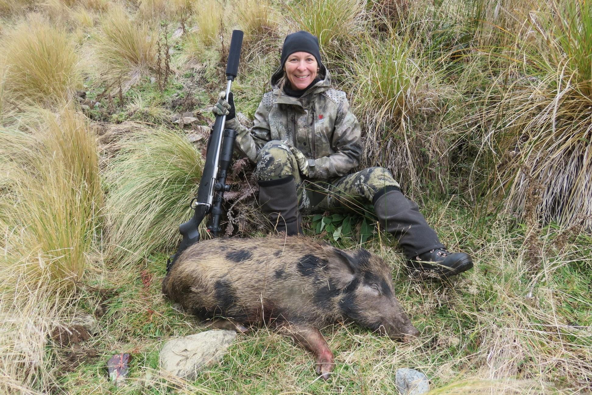 However, my first opportunity did not quite play out this way. Greg and I had covered a fair bit of area at the south end of the block this day and we were headed for camp. He was back behind me and had stopped to glass an adjacent face. I had carried on past a rock face just ahead of us and dropped down into the start of a tight gut. Movement to my right in the long tussock caught my eye. It was a massive ginger razor-back boar adorned with black spots and would soon across my path. He had the most impressive ‘Mohawk’ that went the full length of his body. I immediately dropped to the ground hoping not to be spotted. I pulled my phone out from my pocket for some photos…I know what you’re thinking…. where is her rifle. I had placed this on the ground to get my phone out lol. The boar was mooching along without a care in the world heading towards the bush to my left. I looked for Greg to see what I should do as I was not sure whether to take him or not as I knew there was a good stag in the area. But I could not see Greg. Later I was to find out he was at the rocks doing that whisper/yell voice repeating “Kate, take him”. When I finally did hear him, the newly named ‘Boris’ was quite close to the bush edge. I picked up my new 7mm-08 and lined up on him (I was about to again add to my growing toolbox of learnings) and squeezed off a round. A miss, I couldn’t believe it. The shot felt bang on. Unfortunately, this was a new rifle with a new scope that had adjustable turrets which I had never used before. Over the day, taking it on and off my shoulder, I must have knocked the dial and taken it off zero which sent the shot high. Lesson learned as I watched his butt disappear into the manuka scrub. Greg went in for a look, but he was nowhere to be seen. Many a laugh has been had over this day.