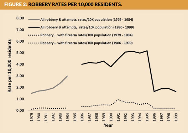 Figure 2: Robbery, (attempts, and aggravated robbery) rates per 10,000 residents. The gap reveals a change in the data collection period. Data are for the five years before the Act, and for three five-year periods after the Act became effective. (Major change in trend may point towards changes in data collection protocols, not necessarily changed homicide rates).