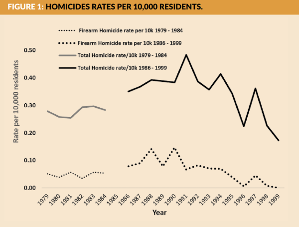 Figure 1: Homicides (murder, manslaughter and related offending) rates per 10,000 residents. The gap reveals a change in the data collection period. Data are for the five years before the Act, and for three five-year periods after the Act became effective. (Major change in trend may point towards changed data collection protocols, not necessarily changed homicide rates).