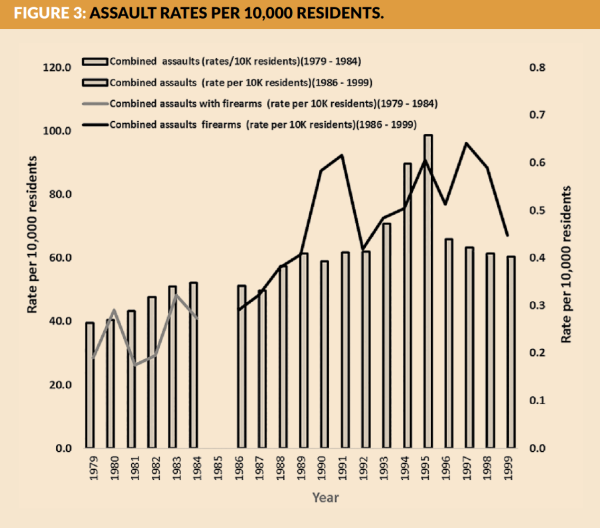 Figure 3: Assaults, (combined grievous, serious and minor) rates per 10,000 residents are shown in vertical bars, with rates on left vertical axis. Those assaults with firearms are shown by lines, rates from the right vertical axis. The gap reveals a change in the data collection period. Data are for the five years before the Act, and for three five-year periods after the Act became effective. (Major change in trend may point towards changes in data collection protocols, not necessarily changed homicide rates). Note too that the involvement of a firearm may not necessarily mean it was used in the offence, it was found at the scene afterwards).