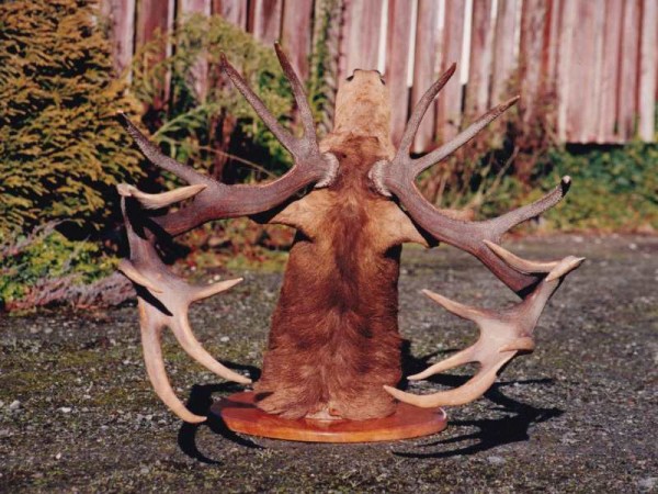 The trophy carried 18 points, six beautiful ones on each top. The length was 42 inches, the spread 36 inches and a beam of 5 3/4 inches. It weighed 23 lbs.