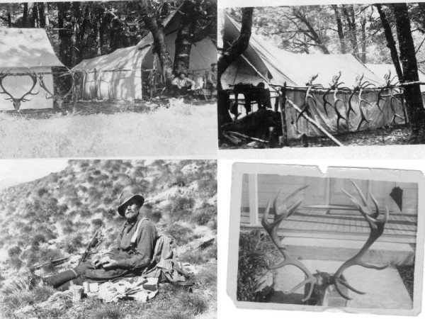 By this time the stag was only about 120 yards off standing chest on and peering over a toi toi bush at us, presenting a rather nasty shot. The toi toi was obscuring his chest. However, I fired four shots at him through the bush and as far as I could see, all he did was lift one front leg as if to stamp his foot. By the time my rifle was empty of cartridges, I felt disgusted to think I could not shoot straight. The hinds by this time had cleared off and as the stag stood still, I thought I must have at least hit him hard, else why was he just standing there. However, Archie, struck dumb at what had happened, rushed back four or five paces to his father, grabbed his rifle and just as the stag wheeled to gallop off, let fly with a beautiful shot, the stag crumpling up in a heap.