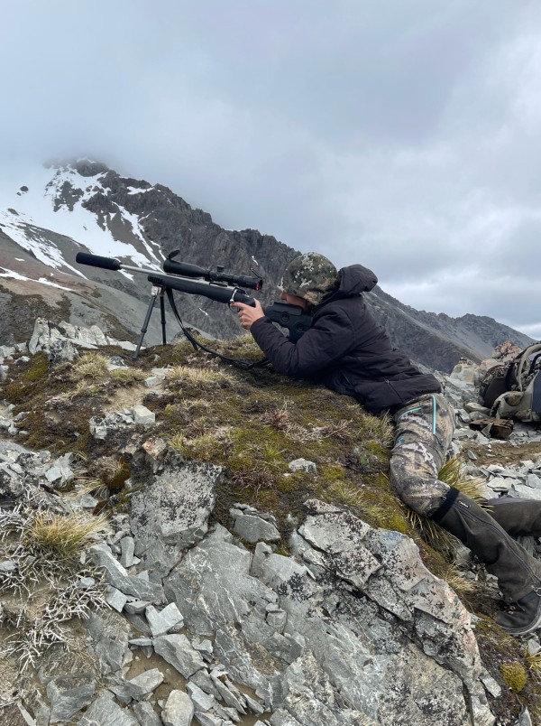 Our trek back to the hut saw us glassing the big bluff and gully system where we'd first encountered reasonable numbers earlier in the day. It was now around 5pm and animals were coming off the hill. We saw a small mob meander down within 500m of us - we crept forward to a tussock mound to get a better look. While none of the animals were of any trophy note, we decided to take one for meat. 355m was the reading as I gently closed the bolt on the Remington 700 Titanium. At just 3.3kg's all up including suppressor and chambered into one of my favourite short action rounds - the 7mm Remington Short Action Ultra Magnum, this is a serious lightweight mountain goat rig. The animal was quartering away as I settled the crosshair on the shoulder point. I squeezed off only to see the half-dozen animals in the mob bolt at high speed across the face and over the lip. We reviewed the video footage to see that the projectile had just missed the very front of the shoulder by a mere whisker- I'd seriously underestimated the stiff breeze bowling up the valley. The Bull suddenly re- appeared at the top of the next terrace. Jack chambered a round in his 300 WM, dialled for the 550m gap and squeezed off. The dust cloud behind confirmed a miss - footage once again confirmed failing to allow sufficient windage into the breeze. Lessons learnt!