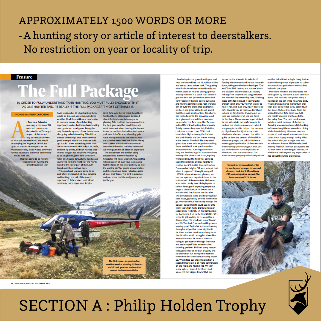 Your entry should be approximately 1500 words or more, and should showcase your skills as a storyteller and your passion for hunting. The winner will receive the prestigious Philip Holden Trophy, as well as a range of hunting gear to help them on their next hunting trip.