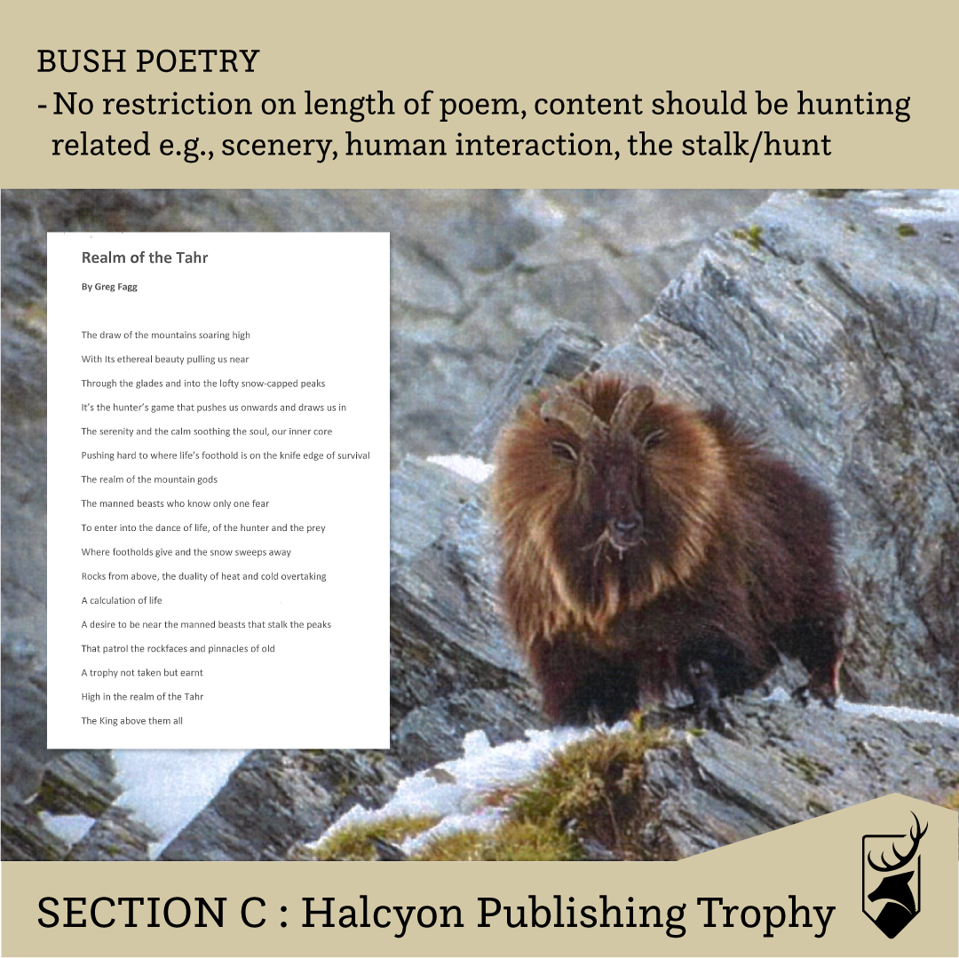 Your poem should capture the spirit of the hunt and showcase your creativity and skill as a poet. The winner will receive the Halcyon Publishing Trophy, as well as a range of hunting gear to help them on their next hunting trip.