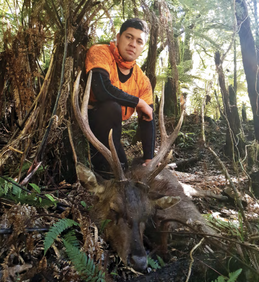 We made it to the top and it flattened out and opened up into the tawa trees. Every now and then I’d be trying my hardest to move as quietly as possible and then have the bloody living daylights scared out of me as a Kereru would fly off making a hell of a racket. Although it was good while it lasted, the nice open bush came to an end and it slowly started to close up and get tight. Before I knew it we were ducking and weaving, bashing our way through supple jack, trying to work our way down the ridge. After a good hour of this, we decided 'bugger it' so we dropped down into a creek and followed it which lead us into a bit of a grassy clearing with clusters of manuka trees and other bushes scattered throughout. I could hear something grazing in there somewhere but after half an hour of looking I never found it and the sound disappeared. By now we had a couple of hours of daylight left so we started angling back towards camp, dropping in and out of creek heads, heading up and down spurs and then ending up back on top again. Callum was far behind me, giving me a bit of space, that’s when I saw it! It popped up out of some crown fern about 60m away and bolted! It was in full flight and ran behind a mound so I couldn't get a shot off. It popped back out on the other side, about to head across the ridge and back down the other side when I lined up the crosshairs and squeezed off a shot, leading it just slightly.