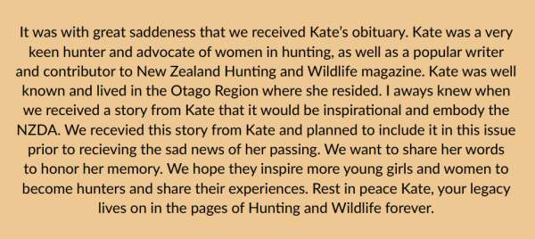Tragically at Beaumont Forest on the 3rd of June, on a Department of Conservation Hunting Block, Kate passed away whilst hunting with her fiancée Greg. At the time of her death, she was fully immersed in her favourite pastime and stalking a Fallow buck on the far side of a creek in steep terrain. Kate joined the Otago Branch of the NZDA in 2019, as an avid, competent, and successful hunter. She had participated in the Otago Branch HUNT’s course acting in the capacity of instructor and assisted with the mentoring/guiding of Woman’s Tahr Hunts in the Mt Cook Area. Kate was an active contributor to ‘NZ Hunting and Wildlife’ magazine and featured regularly in her own, Greg’s and other NZDA