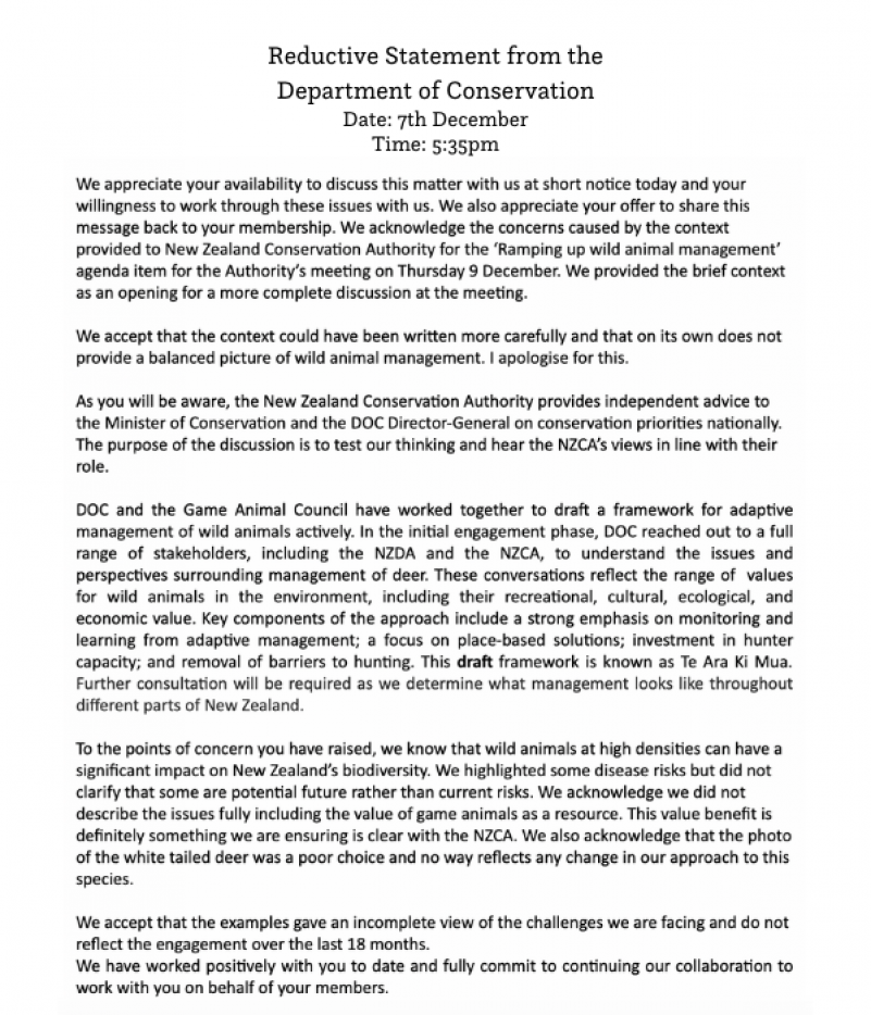 NZDA has met with the Department of Conservation to discuss the misleading paper mentioned in our previous statement. The Game Animal Council also attended the meeting. Our concerns have been voiced and our perspective has been heard.