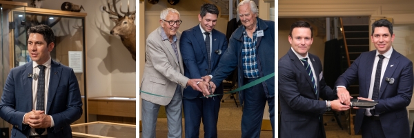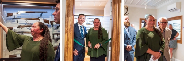 Left: Left: Hon. Minister Nicole McKee with Hon. Minister John Meager. Centre: CEO Gwyn Thurlow and Minister Nicole McKee opening the Gunroom on Friday 14th February 2025. Right: Minister Nicole McKee alongside Sir Mark Dunajtschik.